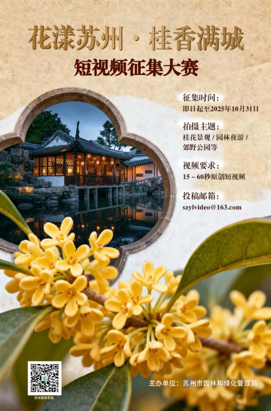 9月20日啟動的“花漾蘇州,桂香滿城”短視頻征集大賽題材范圍,以桂花景觀、園林夜游、郊野公園景觀為主題,來自海內外的游客與蘇州市民都可參與。作品要求視頻時長:15-60秒;格式規范:畫面清晰、構圖合理,橫屏/豎屏均可,拍攝手法不限,符合短視頻平臺播放標準。作品須為原創,嚴禁抄襲或侵權,違規者將取消參賽資格,因抄襲或侵權造成的損失由參賽選手自行承擔。若因此給主辦單位造成損失的,主辦單位保留追究參賽選手責任的權利。