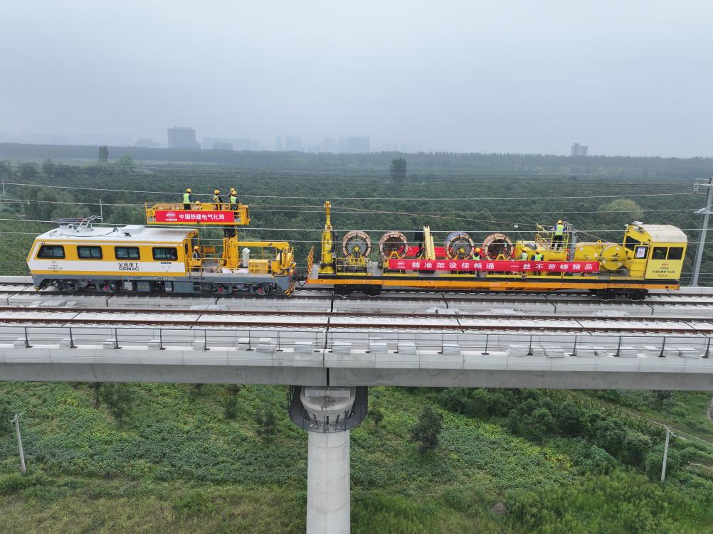 圖為淮宿蚌城際鐵路全線首條接觸網導線架設現場。(中國鐵建電氣化局供圖)