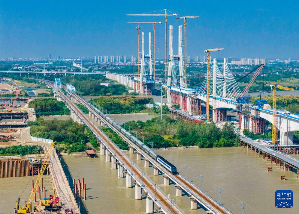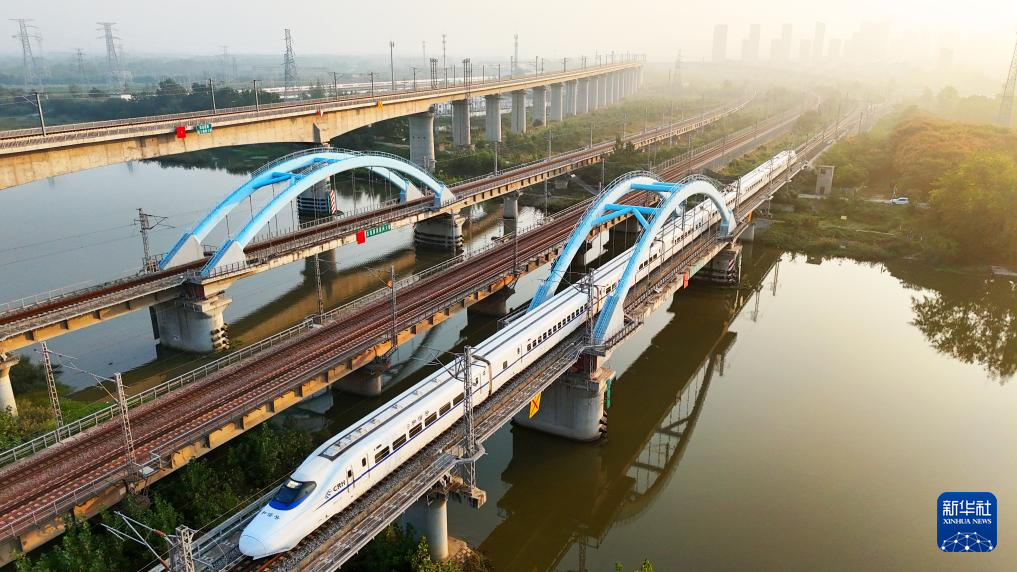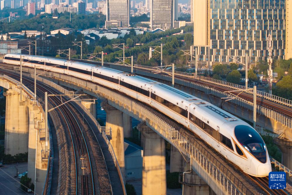 10月10日在江蘇南京拍攝的行駛中的動車組列車(無人機照片)。