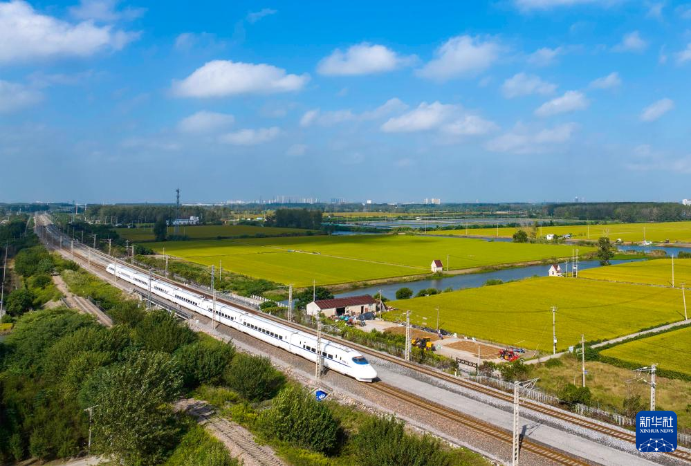 10月10日,列車行駛在寧啟鐵路江蘇揚州段(無人機照片)。